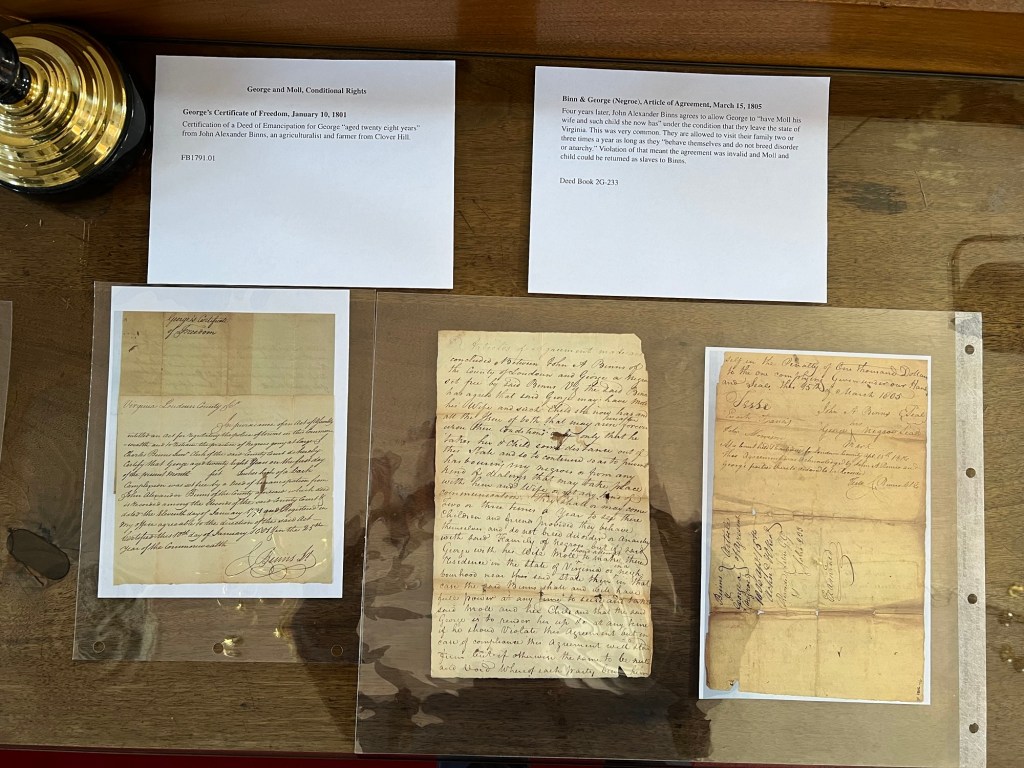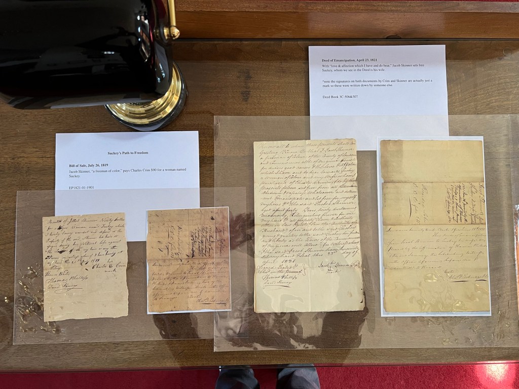 A display of some of the items from the Enslaved and Free Black Papers collection at the Loudoun County Historic Records and Deeds office. Newly discovered deed of emancipation from Levin Powell dated 1799.George and Moll, Conditional Rights. Emancipation papers with terms. Suckey’s Path to Freedom.