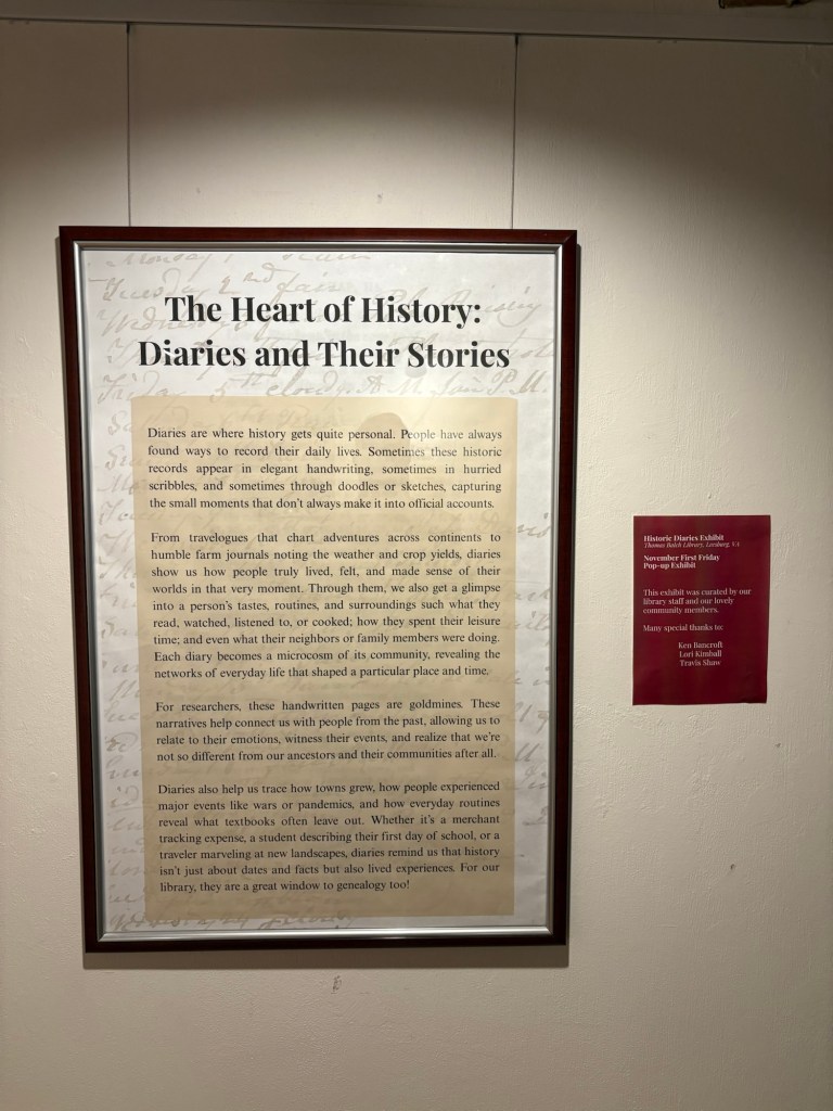 Happy to present the Journal of Nicholas Cresswell with the Thomas Balch Library as part of First Friday in Leesburg. Displays discussed his travels in the Indian Country, his experience with slavery in the colonies, and his growing distaste for the independence movement which had cast him as a Tory/Loyalist to the crown. Great primary source material for Loudoun County in the Revolutionary War.